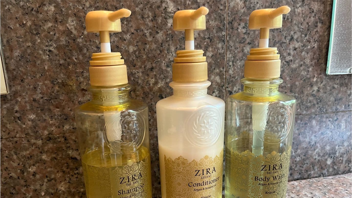 ノンシリコンのシャンプーとコンディショナー、ボディシャンプーをご準備しています。